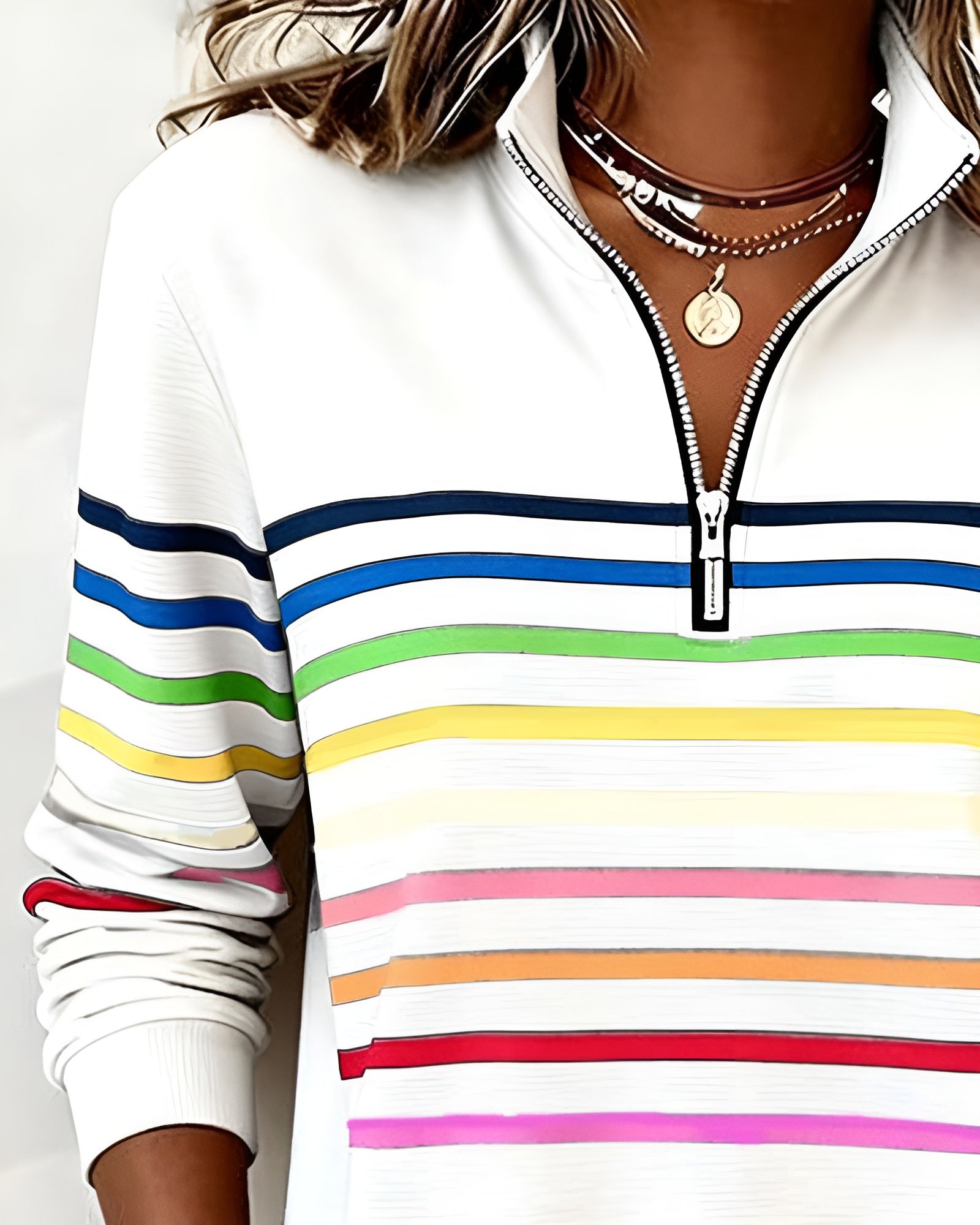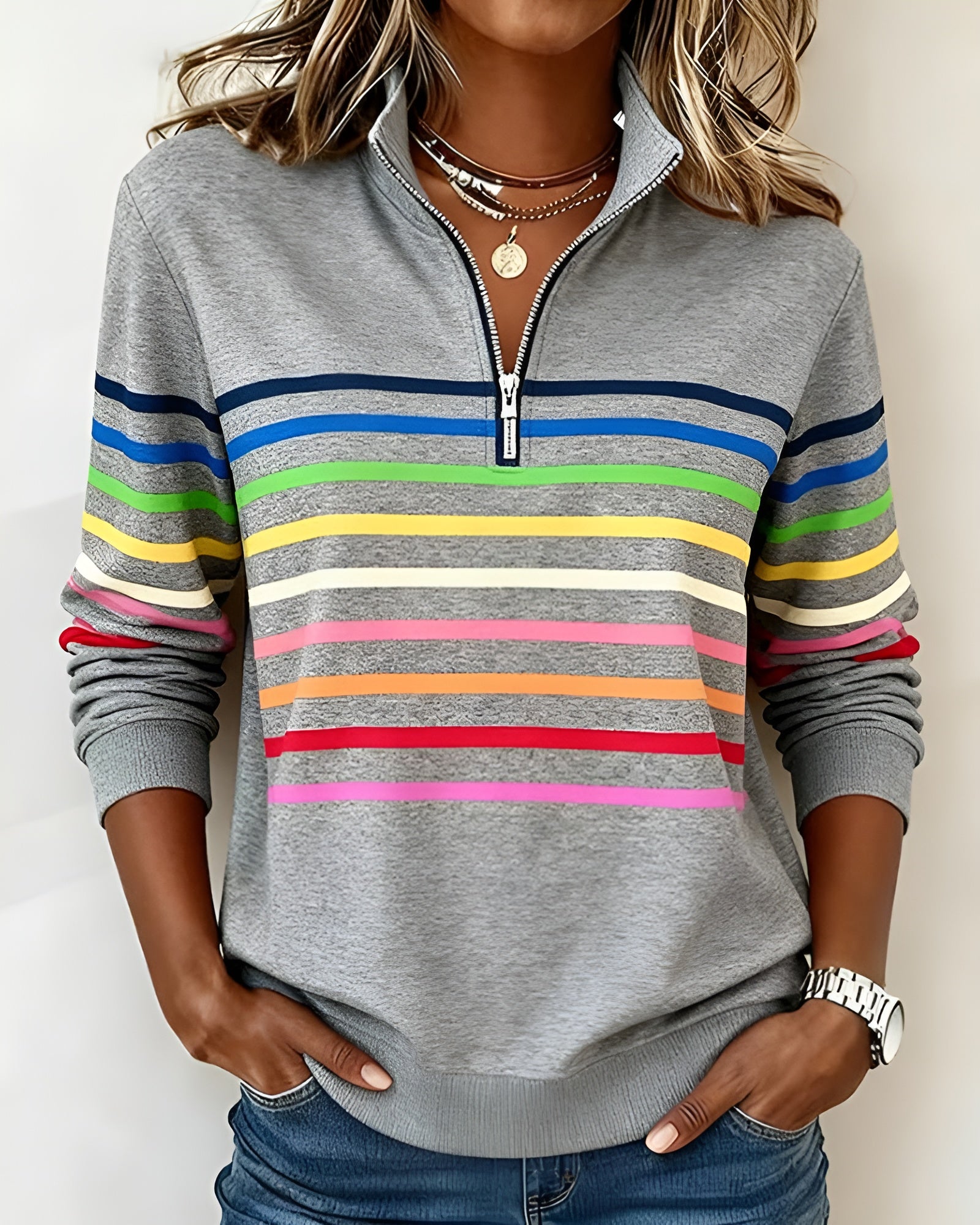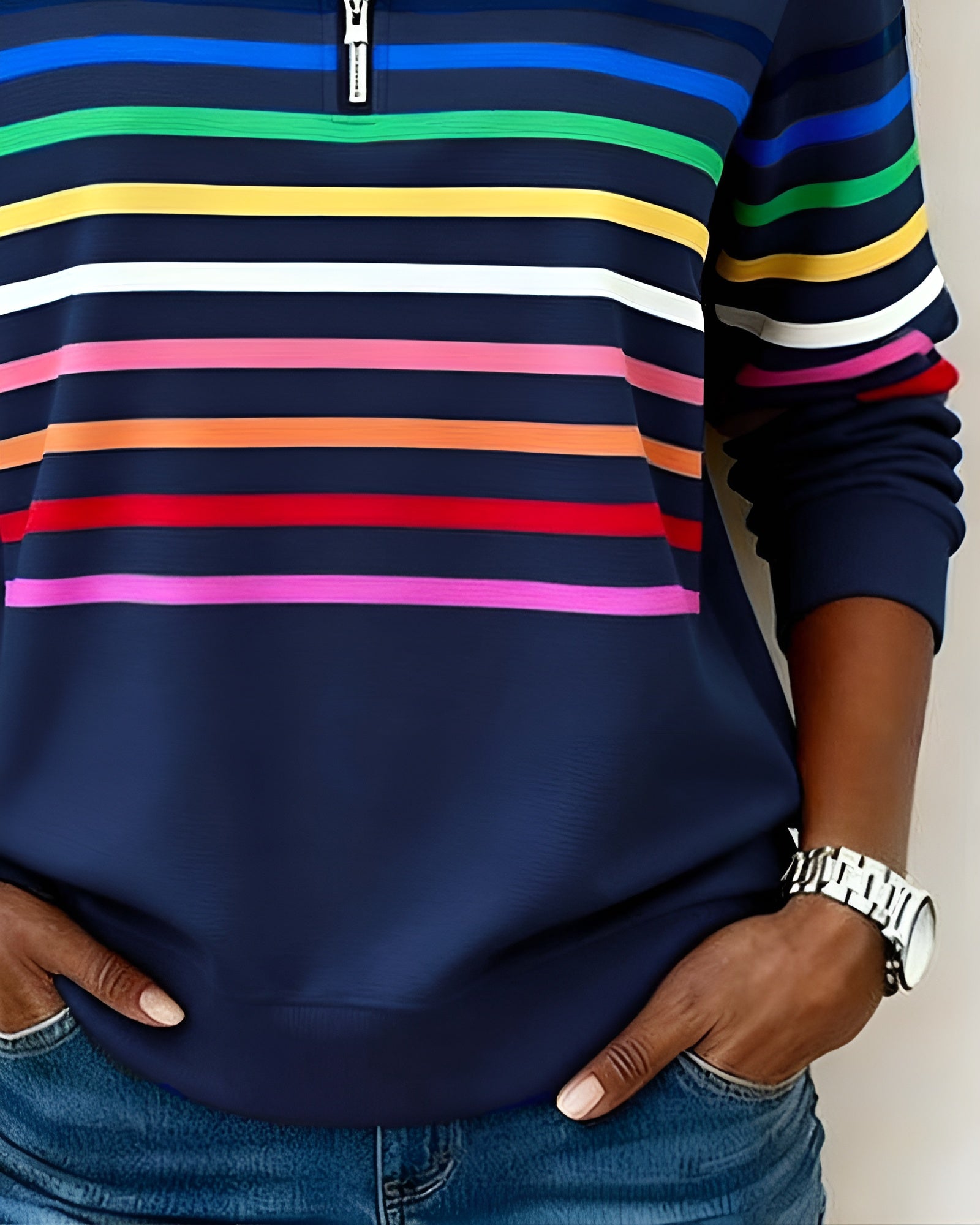 Låt din outfit tala för sig själv med Margit™. Denna tröja är skapad för kvinnor som vill känna sig bekväma och samtidigt se välklädda ut – helt utan ansträngning. Den avslappnade passformen följer dina rörelser under dagen, medan de färgglada ränderna ger ett fräscht och energiskt uttryck. Den höga kragen med dragkedja låter dig variera mellan en ledig och en mer uppklädd stil, precis som det passar ditt tillfälle.